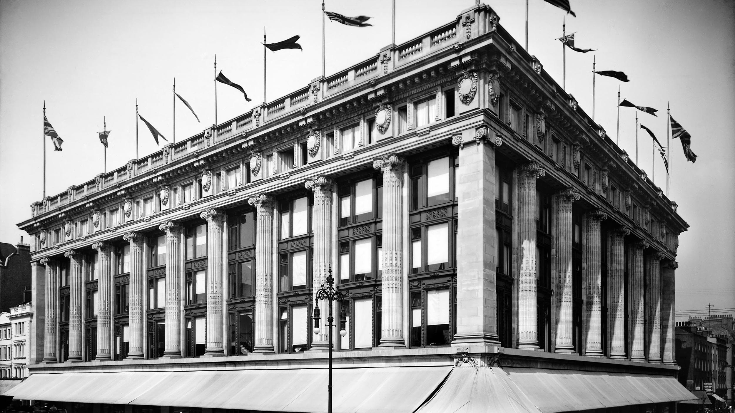 The initial design was by Daniel Burnham, a big-spirited American architect who had worked for Marshall Field’s and, significantly, had designed much of the 1893 Chicago World’s Fair, a successor to London’s Great Exhibition of 1851. One of Burnham’s assistants in London was Thomas Tait, one of whose major works was the extension to the British Museum of 1905. In Oxford Street, Selfridge’s design team shaped an ambitious Beaux Arts classical palace – or indeed museum – of a building, its noble ionic facade rising above a wall of plate glass windows.