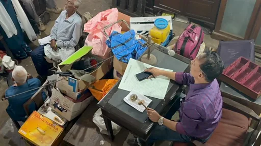 एक शख़्स है जो क़रीब 5 फीट की ऊंचाई पर टेबल और कुर्सी लगाकर बैठा है.